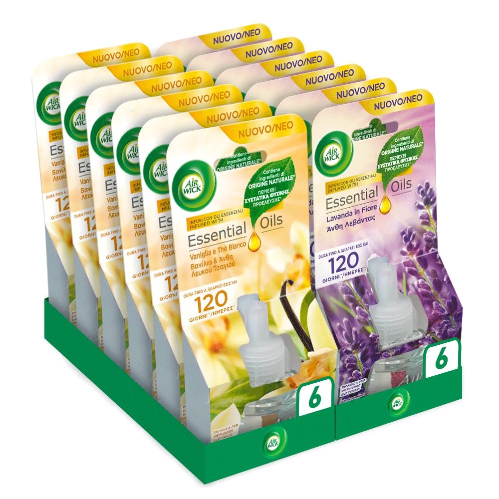 Airwick Nachfüllpackungen für elektrischen Diffusor für ätherische Öle, 12 Nachfüllpackungen für elektrische Raumduft, 6 Vanille und weißer Tee, 6 Lavendelblüte