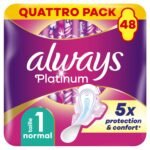 Die geruchsneutralisierende Technologie schließt Gerüche ein, damit Sie sich während Ihrer Periode frisch und sauber fühlen|Das Flex & Fit-System hält die Damenbinde an Ort und Stelle und folgt Ihren Körperbewegungen|Die Flügel halten Ihre Polster an Ort und Stelle und bieten Komfort und zuverlässigen Schutz|Dermatologisch getestet, sanft zur Haut|Dieses Product enthält: 1 x Always – Platinum Damenbinde Normal mit Flügeln – 48 Stücke