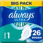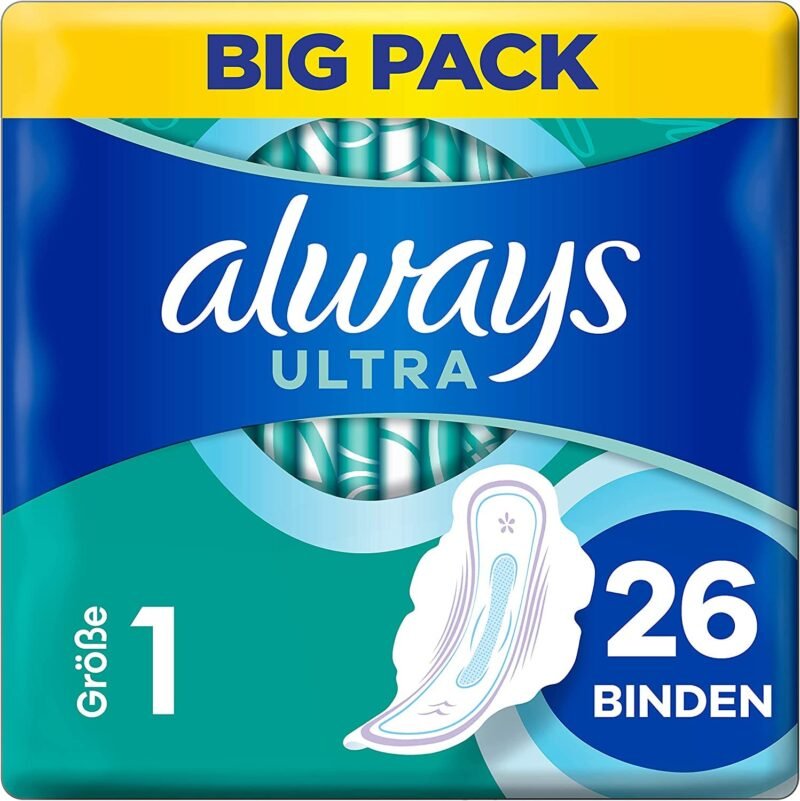 Always Ultra Binden Damen Gr. 1, Normal (26 Damenbinden mit Flügeln) Big Pack, dünn und super saugfähig, geruchsneutralisierend und Auslaufschutz