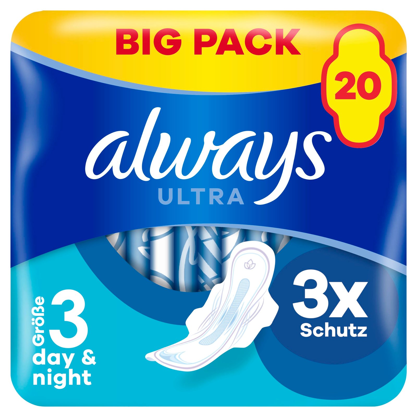 Always Ultra Binden Damen Gr. 3, Day & Night (20 Damenbinden mit Flügeln) Big Pack, dünn und super saugfähig, geruchsneutralisierend und Auslaufschutz