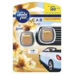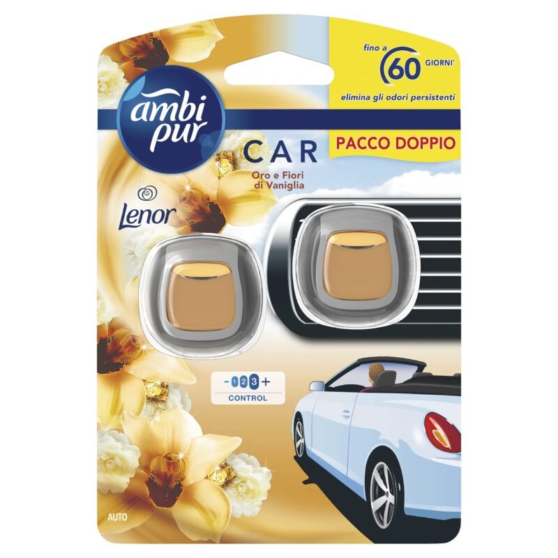 Ambi Pur Auto-Lufterfrischer, 2 Auto-Lufterfrischer, Gold- und Vanilleblüten, beseitigt Gerüche, einfach zu befestigen, für bis zu 30 Tage Duft für Deodorant, Einweg und Wettkampf