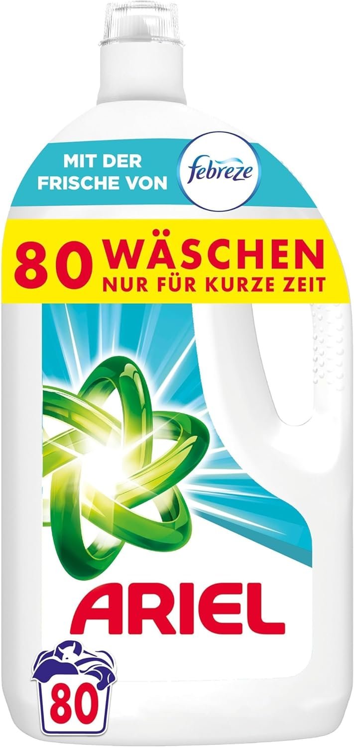 KRAFTVOLLE FLECKENENTFERNUNG: Ariel Flüssigwaschmittel sorgt für kraftvolle Fleckenentfernung schon ab der 1. Wäsche|Nr. 1 MEISTEMPFOHLENE WASCHMITTELMARKE: Von führenden Waschmaschinenmarken in Deutschland, wie z. B.: Bauknecht Siemens Bosch AEG|ENTWICKELT FÜR DIE KALTWÄSCHE: Ariel Flüssigwaschmittel bietet hervorragende Fleckenentfernung, selbst bei Kaltwäsche. Kälter waschen: Spare bei jedem Waschgang Energie und reduziere die COâ‚‚-Emissionen deiner Wäsche|FRISCHE VON FEBREZE: Ariel Flüssigwaschmittel mit Frische von Febreze für lang anhaltenden Frische|FLECKEN-VORBEHANDLUNG: 1. Eine kleine Menge Ariel Flüssigwaschmittel auf die Flecken geben 2. Sanft einreiben 3. Waschgang starten|OPTIMALES ERGEBNIS: Fülle die grüne Dosierkappe mit Ariel Flüssigwaschmittel und gib sie in die Trommel auf die Wäsche|BESTELLE DEINE KOSTENLOSE DOSIERKAPPE: Aus Gründen des Umweltschutzes verfügen nicht alle Flaschen über eine Dosierkappe. Diese ist kostenlos über die Webseite for-me-online.de/marken/ariel erhältlich
