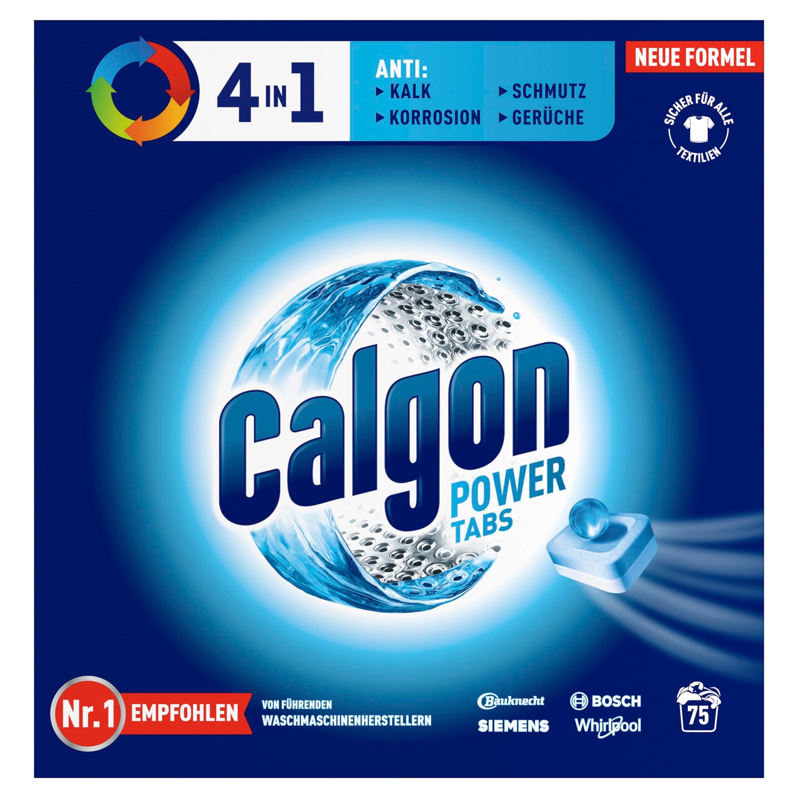 SCHUTZ UND REINIGUNG: Die Calgon Tabs schützen die Waschmaschine nicht nur vor Kalkablagerungen, sondern verhindern bei jedem Waschgang auch noch Rückstände und störende Gerüche|FÜR SAUBERKEIT, DIE MAN SEHEN UND RIECHEN KANN: Die Calgon Power Tabs hinterlassen eine saubere Waschmaschine und beugen zugleich unangenehmen Gerüchen vor|MAXIMALE EFFIZIENZ: Die 4-in-1 Power Tabs verhindern, dass sich Waschmittel- und Weichspülerreste in Maschinenteilen ablagern, die die Leistung der Waschmaschinen beeinträchtigen könnten|SCHUTZ VOR KALK, SCHMUTZ UND KORROSION BEI JEDEM WASCHGANG: Einfach einen Power Tab zum Waschmittel in das Hauptwaschfach hinzugeben und so die Waschmaschine länger leben lassen|LIEFERUMFANG: 1 x 75 Power Tabs von Calgon / Kraftvoller Schutz vor Kalk und Schmutz / Beugt Gerüchen vor / Wasserenthärter für die Waschmaschine|GEMEINSAM GEGEN PLASTIK IM OZEAN: Mit jedem Kauf helfen Sie uns insgesamt 5 Millionen Plastikflaschen aus der Umwelt zu sammeln (Bei Verkauf durch Amazon/Pennguin 1 Flasche = 20g Plastikmüll)