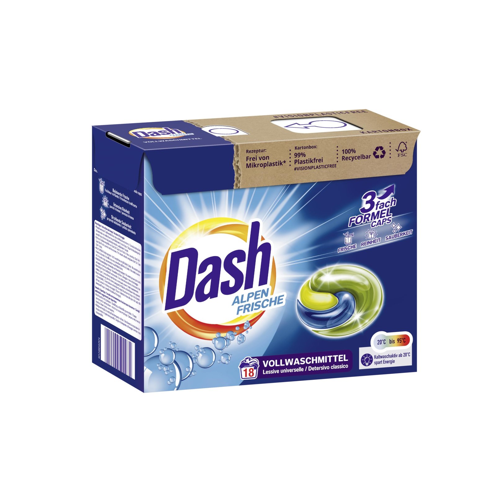Dash® Alpen Frische 3in1 Vollwaschmittel-Caps I 18 Waschladungen I Kraftvolle Reinigung, Fleckenentfernung & Alpenfrische für weiße Wäsche