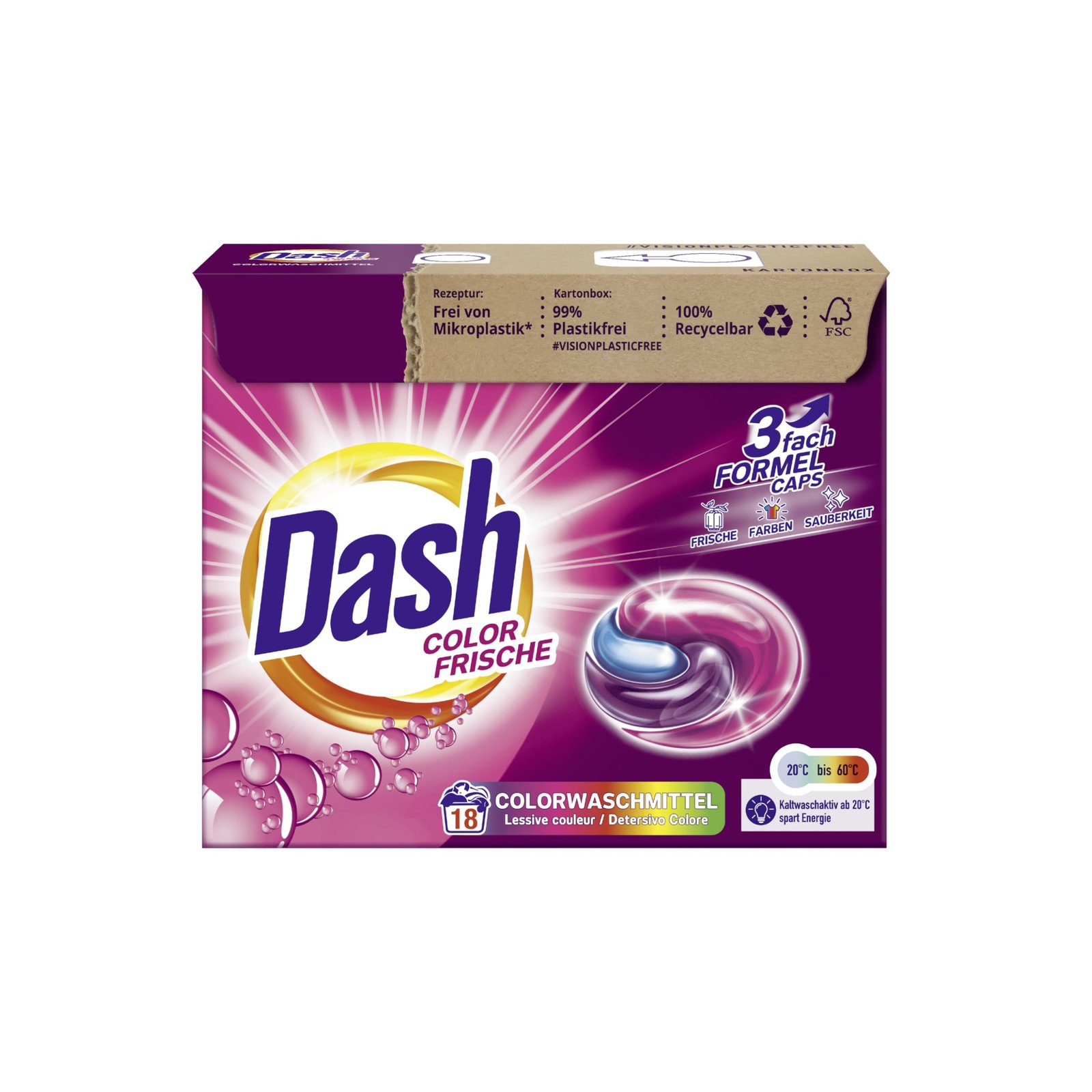 Dash 3in1 COLOR FRISCHE Colorwaschmittel-Caps mit der 3fach Formel für frische, saubere und langanhaltende Farben deiner Kleidung. Praktisch für Dich, nachhaltig für die Umwelt: Keine Überdosierung, da perfekt vordosiert.