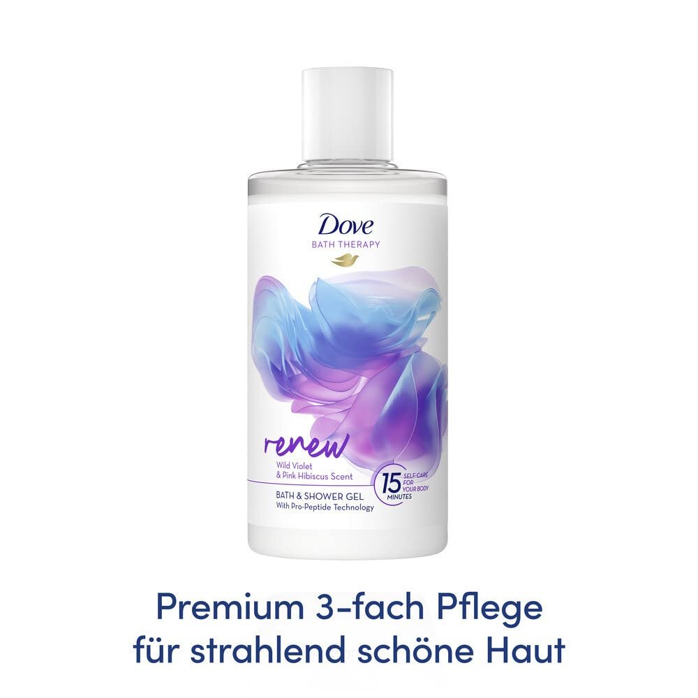 Dove Bath Therapy Bad Und Duschgel Renew ist die Dusch- und Baderoutine für entspannende und wohltuende Self-Care-Momente|Zu resilienter, gestärkter Haut trägt die Duschgel Variante Renew dank ihrer Formel mit Pro-Peptid-Technologie bei|Das Bad Und Dusch Gel enthält Wasch- und Pflegestoffe 96 Prozent natürlichen Ursprungs|Das Dove Duschgel ist pH-neutral und ohne Sulfat SLES|Das Bath Therapy Bad Und Duschgel verleiht einen verwöhnenden Duft von wildem Veilchen und pinkem Hibiskus