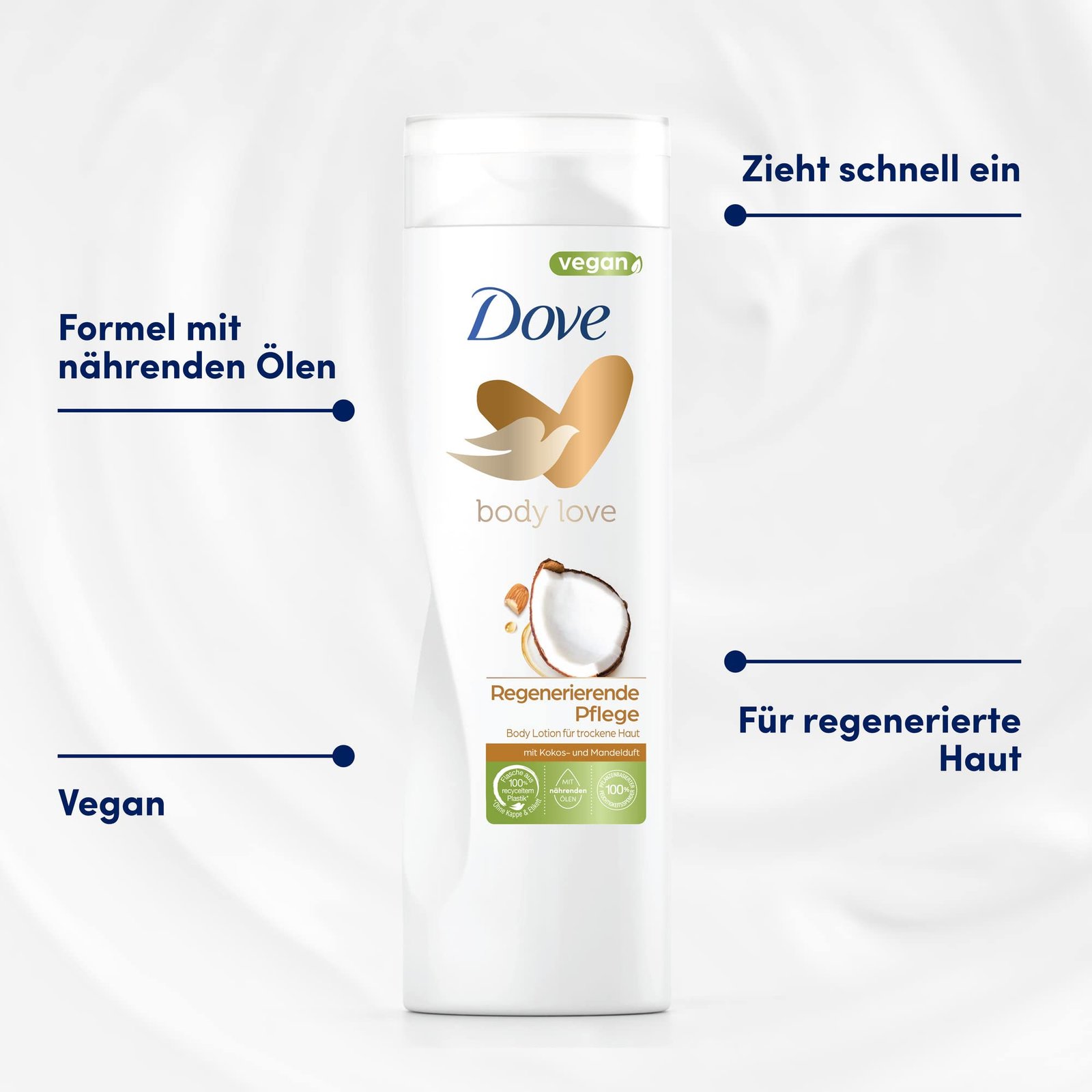 Dove Body Love Body Lotion Regenerierende Pflege für trockene Haut enthält nährende Öle und ist vegan|Dove Body Lotion verwöhnt die Sinne mit einem Duft nach Mandel und Kokos|Die Körperlotion zieht schnell ein und spendet sofort Feuchtigkeit für trockene Haut|Die Body Lotion mit 100% pflanzenbasiertem Feuchtigkeitsspender ist dermatologisch bestätigt|Die Body Lotion ist Peta Approved|Die Flasche der Bodylotion ist zu 100%* aus recyceltem Plastik (*ohne Kappe & Etikett)