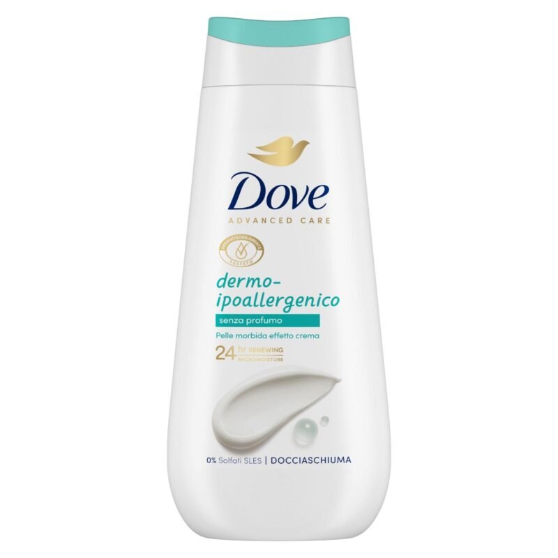 Dove Hypoallergenes Dermo-Duschgel, feuchtigkeitsspendendes Duschgel, milde Formel auf dem Hautmikrobiom, pflanzliche Feuchtigkeitsspender, SLES-frei, Duschbad für Damen und Herren, 225 ml