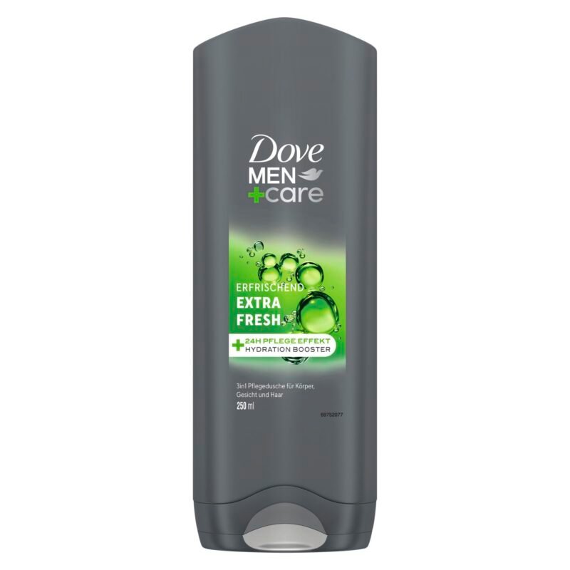 Dove Men+Care 3-in-1 Pflegedusche Extra Fresh in einer zu 100% recycelten Flasche*|Das Duschgel eignet sich zur Feuchtigkeitspflege für gesunde und kräftige Männerhaut|Duschbad mit innovativer Hydration Boost-Technologie, die der Haut intensiv Feuchtigkeit spendet|PETA-zertifiziertes Männerduschgel mit ergiebiger, leicht abzuspülender Formel und mit hauteigenen Pflegestoffen|Dove Men+Care 3-in-1 Pflegedusche Extra Fresh reinigt und pflegt Körper, Gesicht und Haare wirkungsvoll und nachhaltig|Die Pflegedusche sorgt für eine erfrischende Reinigung und ein angenehmes Hautgefühl