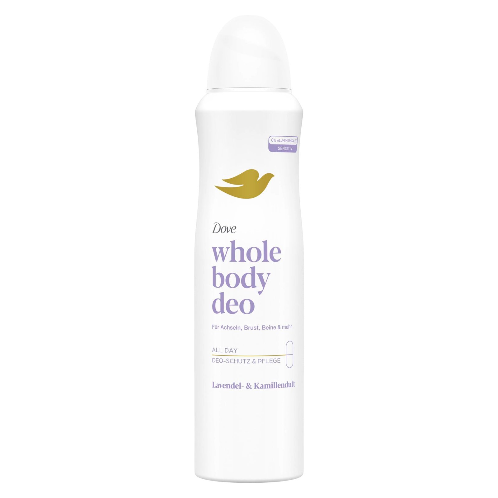 Dove Whole Body Deo Lavendel- & Kamillenduft Deospray mit 0% Aluminiumsalze für Achseln, Brust, Beine und mehr 150 ml