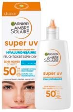 Antioxidativer Sonnenschutz mit Lichtschutzfaktor 50+, Effektives und pflegendes Sonnenschutz-Fluid mit feuchtigkeitsspendender Hyaluronsäure|Ergebnis: Intensiver Schutz vor Sonnenbrand und sonnenbedingten Pigmentflecken, Mattes und unsichtbares Finish ohne Fettrückstände|Anwendung: Großzügiges Auftragen bereits vor dem Sonnenbad, Gleichmäßiges Einmassieren und regelmäßiges Auffrischen, Auch anwendbar unter Make-Up|Ultraleichte und schnell einziehende Textur für optimalen Sonnenschutz, Sonnencreme mit feuchtigkeitsspendender Hyaluronsäure für einen pflegenden Effekt|Lieferumfang: Garnier Ambre Solaire Anti-Oxidativ Super UV Sonnenschutz-Fluid LSF 50+ mit Hyaluronsäure, 1 x 40 ml