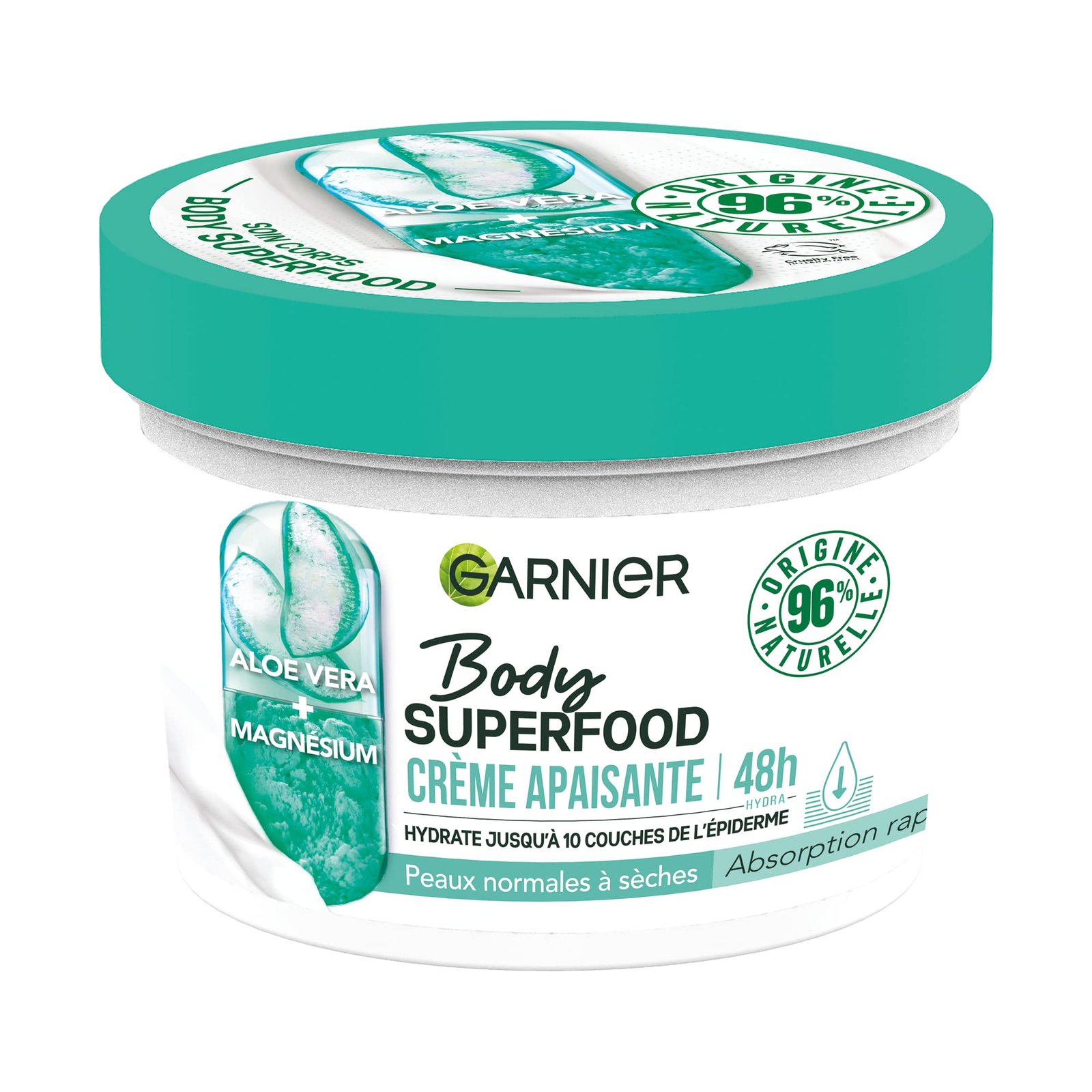 Garnier – Body Superfood – Beruhigende Körperpflegecreme – 48h Flüssigkeitszufuhr – Vegane und zu 96% natürliche Formel – Mit Aloe Vera und Magnesium – Für normale bis trockene Haut – 380 ml
