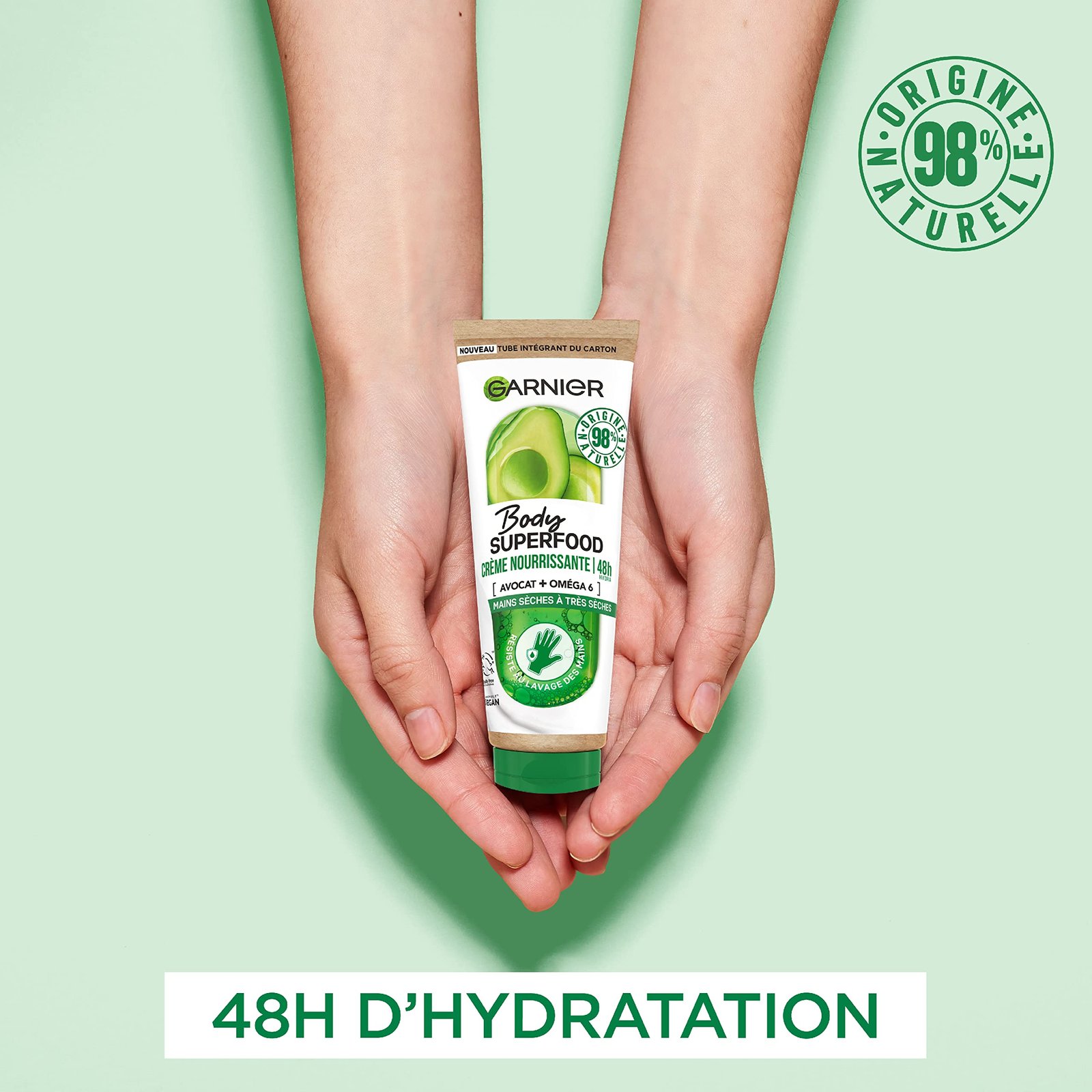 Garnier Body Superfood – pflegende Handcreme 48 Stunden mit Avocado & Omega 6 – vegane Formel mit 98% natürlichen Inhaltsstoffen – für sehr trockene Hände – 75 ml