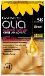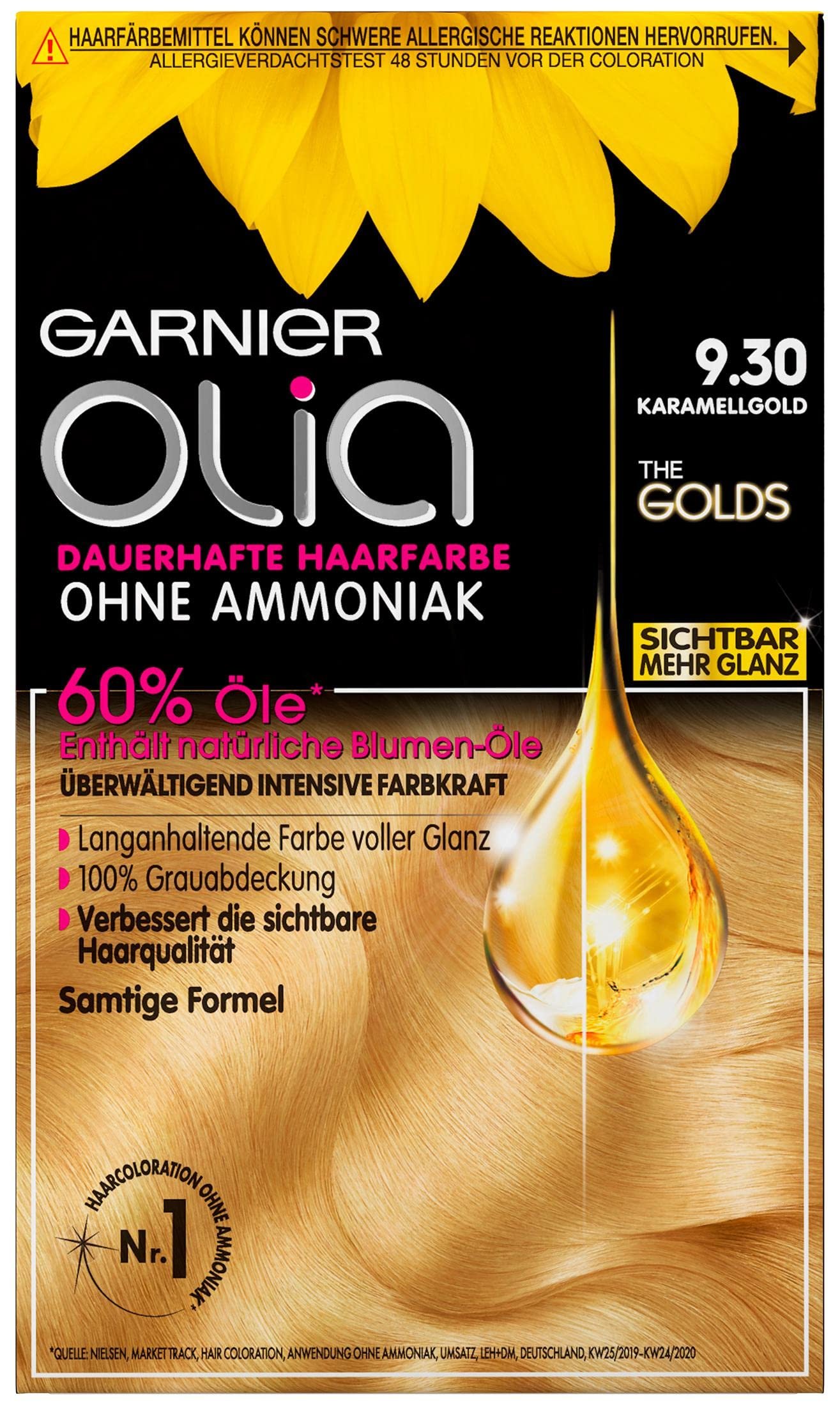 Haarfärbe-Set zum Färben natürlicher, gesträhnter oder colorierter Haare und Ansätze, Inklusive reichhaltigem Conditioner für glänzende Farbe|Ergebnis: Komplette Grauhaarabdeckung, langanhaltendes, intensives und glänzendes Farbergebnis sowie sichtbar verbesserte Haarstruktur|Anwendung ohne Tropfen: 1. Färben der Haare mit pflegender Creme Farbe 2. Auswaschen nach 30 Minuten Einwirkzeit 3. Intensive Pflege mit Seide & Glanz Pflegekur|Anti-Mattheit Formel angereichert mit 60% natürlichen Blumenölen, Samtige und blumig duftende Creme-Textur für angenehme Anwendung und geschmeidiges Gefühl|Lieferumfang: 1x Garnier Olia Dauerhafte Coloration, inkl. Colorations-Creme, Entwickler-Creme, Haarkur für mehrere Anwendungen, Einmalhandschuhe, 1x Gebrauchsanweisung, Farbe: 9.30 Karamellgold (Blond)