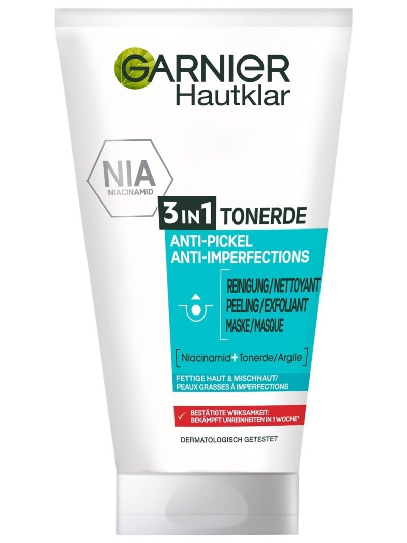 Antibakterielle Reinigungscreme mit 3-fach-Wirkung gegen Pickel und Mitesser, Geeignet für fettige, zu Unreinheiten neigende Haut sowie Mischhaut|Sichtbar verfeinertes Hautbild: Porentiefe Reinigung der Haut, Mattierter Teint dank Talgreduktion, Porenbefreiende Wirkung|Tägliche Anwendung als Waschgel oder Gesichtspeeling auf der feuchten Haut, 3x pro Woche als Gesichtsmaske mit 3 min Einwirkzeit, Gründlich abspülen|Formel mit Eukalyptus, reiner Tonerde und mit Mikro-Partikeln aus Bimsstein zur Entfernung abgestorbener Hautschüppchen und Bekämpfung von Mitessern|Lieferumfang: Garnier Hautklar 3in1 Reinigung + Peeling + Maske, Inhalt: 150 ml