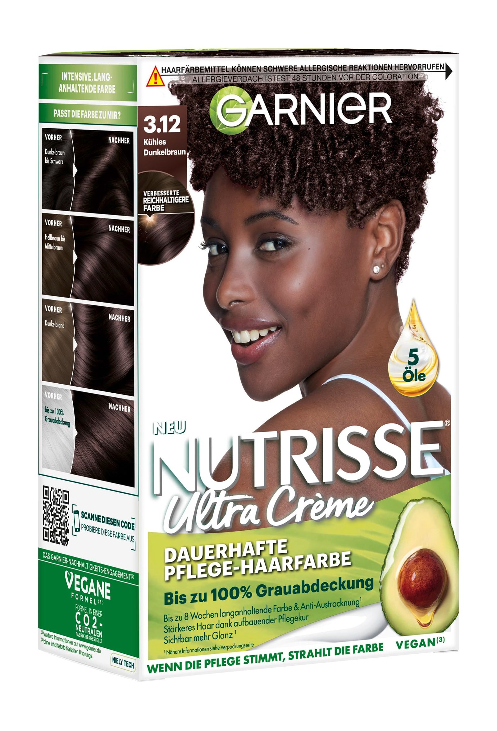 Garnier Nutrisse Crème Cool Browns, dauerhafte Pflege-Haarfarbe, 100% Grauabdeckung, 8 Wochen satte Farbe, 3.12 Kühles Dunkelbraun