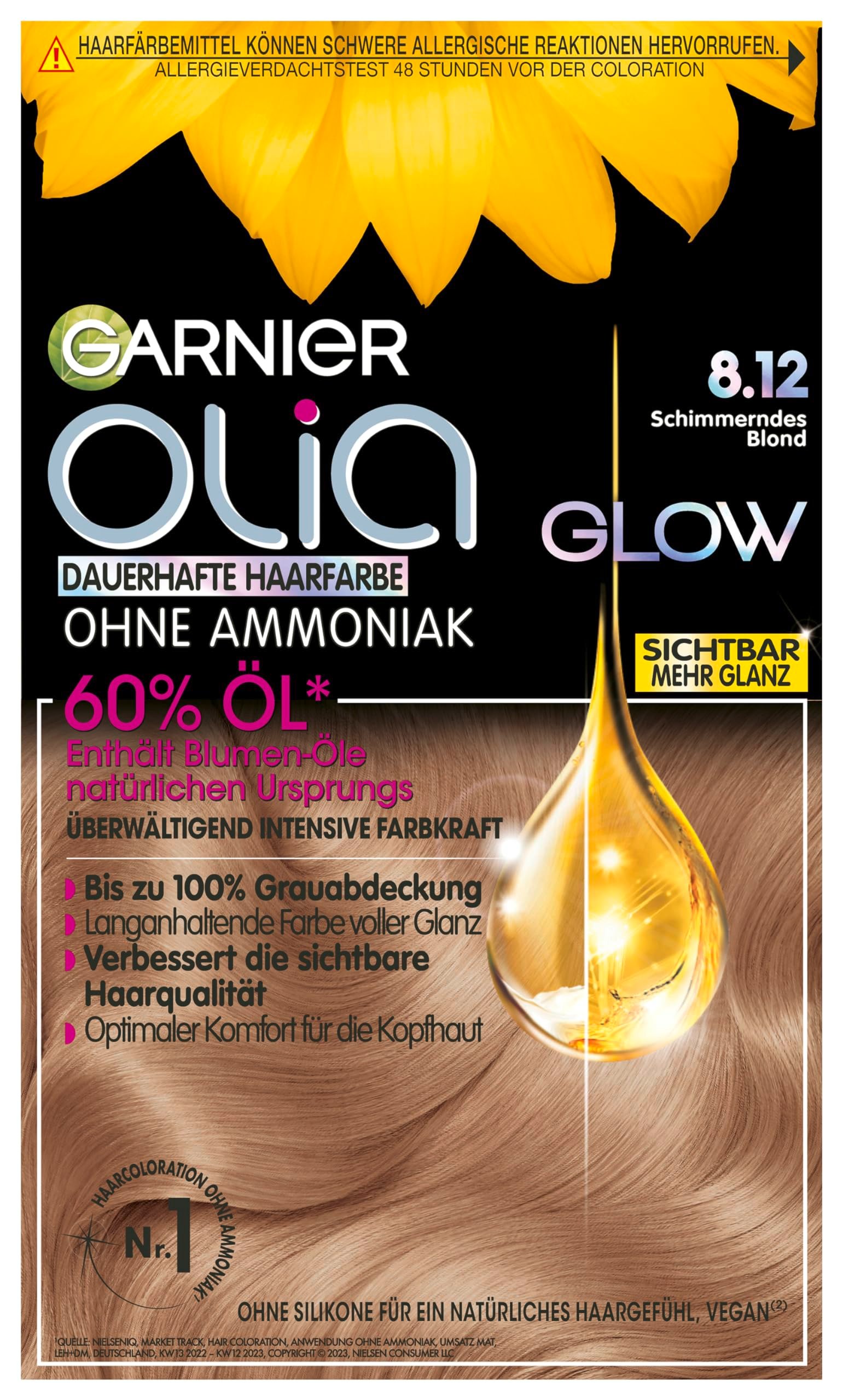 Die Olia Glow verleiht eine strahlende Farbintensität, ohne Ammoniak|Die Haarcoloration sorgt für bis zu 100 % Grauabdeckung und verleiht einen natürlich aussehenden Glanz|Dank der cremigen Formel mit natürlichen Blumen-Ölen werden die Haare samtig gepflegt und erhalten mehr Geschmeidigkeit und Glanz|Die Olia Glow von Garnier basiert auf natürlichen Ölen und verleiht eine langanhaltend schöne Haarfarbe|Die Olia Glow Haarcoloration enthält keinen Ammoniak und duftet angenehm