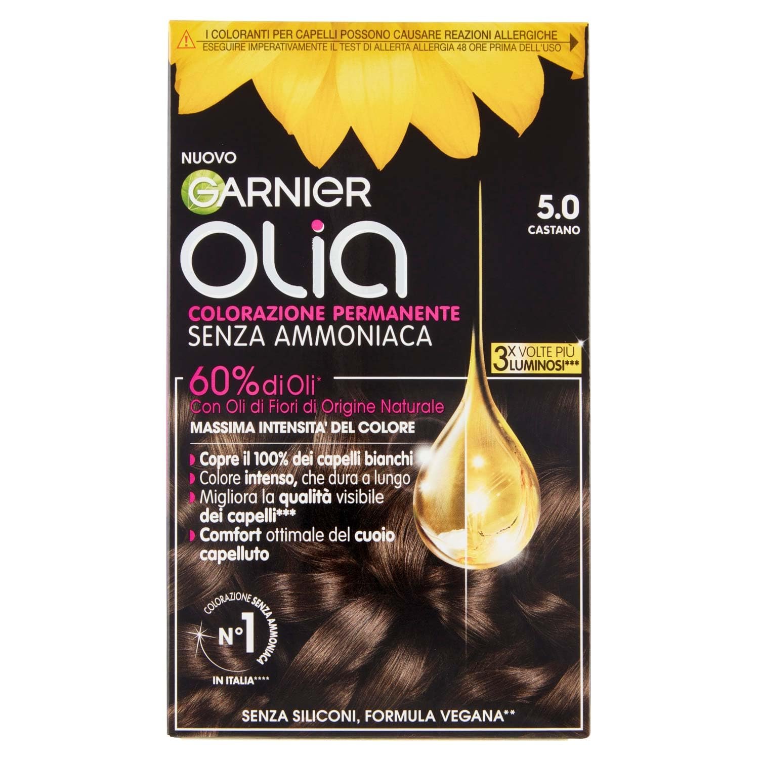 Garnier Olia, Permanente Haarfarbe mit Blütenölen natürlichen Ursprungs, leichter und angenehmer blumiger Duft, samtige Creme, die nicht tropft, ultra-sensorische Anwendung|Für eine langanhaltende, intensive Farbe, deckt 100% weißes Haar ab, weicheres und glänzendes Haar, optimaler Komfort der Kopfhaut|Anwendungsempfehlung: Auf die Bereiche auftragen, wo das Haar weißer ist, 30 Minuten einwirken lassen, mit warmem Wasser abspülen und den Glanz & Seide Conditioner auftragen, 48 Stunden vor Gebrauch den Allergietest durchführen|O.D.S-Technologie: Färbung aus 60 % Ölen, die die Farbe im Inneren der Haarfaser infundieren, vegane Formel, ohne Silikone, ohne Ammoniak|Inhalt: 1 x Garnier Olia Haarfarbe, Farbe: Braun, Das Kit beinhaltet: 1 x Detektor Creme, 1 x Farbtube 1 x Conditioner Licht & Seide ohne Silikone