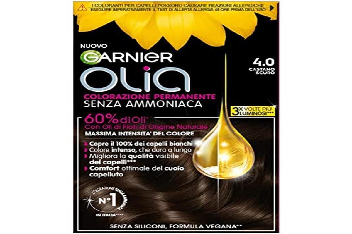 Garnier Olia, Permanente Haarfarbe mit Blütenölen natürlichen Ursprungs, leichter und angenehmer blumiger Duft, samtige Creme, die nicht tropft, ultra-sensorische Anwendung|Für eine langanhaltende, intensive Farbe, deckt 100% weißes Haar ab, weicheres und glänzendes Haar, optimaler Komfort der Kopfhaut|Anwendungsempfehlung: Auf die Bereiche auftragen, wo das Haar weißer ist, 30 Minuten einwirken lassen, mit warmem Wasser abspülen und den Glanz & Seide Conditioner auftragen, 48 Stunden vor Gebrauch den Allergietest durchführen|O.D.S-Technologie: Färbung aus 60 % Ölen, die die Farbe im Inneren der Haarfaser infundieren, vegane Formel, ohne Silikone, ohne Ammoniak|Inhalt: 1 x Garnier Olia Haarfarbe, Farbe: Dunkelbraun, Das Set beinhaltet: 1 x Detektor Creme, 1 x Farbtube 1 x Balsam Licht & Seide ohne Silikone