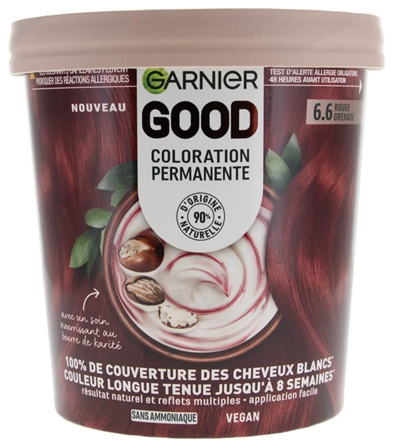 Permanente Haarfarbe mit cremiger Textur und ohne Ammoniak, lang anhaltend und hohe Deckkraft, mit einer mit Sheabutter angereicherten Pflege für das Haar|Ergebnisse: Ein natürliches Ergebnis mit mehreren Reflexen, hält bis zu 8 Wochen*, 100 % Abdeckung von weißem Haar (*Instrumentelltests)|Anwendungshinweise: Sensorische Anwendung per Hand (mit den Handschuhen im Lieferumfang enthalten) als Maske, lesen Sie die Anleitung vor der Anwendung sorgfältig durch und führen Sie einen Allergietest 48 Stunden durch|Vegane Formel** besteht zu 90 % aus Inhaltsstoffen natürlichen Ursprungs und umweltfreundlichem Topf (45 % weniger Kunststoff als andere. Garnier Classic Set), **keine Inhaltsstoffe tierischen Ursprungs oder Derivate|Inhalt: 1 x Garnier Good, Granatapfelrot (6.6), Enthaltene Creme, Farbcreme, pflegende Pflege mit Sheabutter, Handschuhe, Spatel und Gebrauchsanweisung
