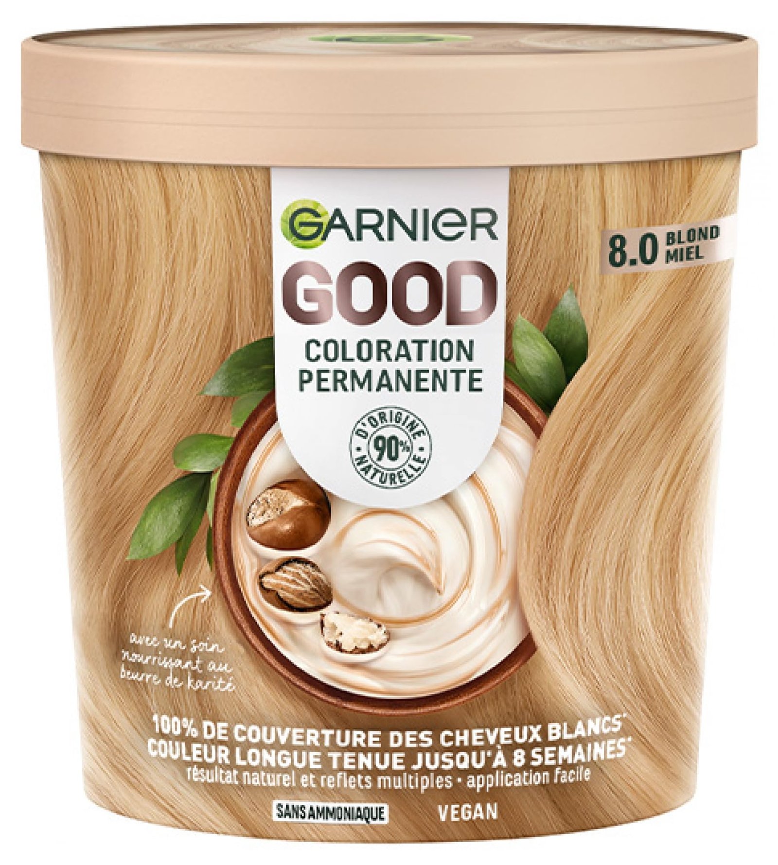 Permanente Haarfarbe mit cremiger Textur und ohne Ammoniak, lang anhaltend und hohe Deckkraft, mit einer mit Sheabutter angereicherten Pflege für das Haar|Ergebnisse: Ein natürliches Ergebnis mit mehreren Reflexen, hält bis zu 8 Wochen*, 100 % Abdeckung von weißem Haar (*Instrumentelltests)|Anwendungshinweise: Sensorische Anwendung per Hand (mit den Handschuhen im Lieferumfang enthalten) als Maske, lesen Sie die Anleitung vor der Anwendung sorgfältig durch und führen Sie einen Allergietest 48 Stunden durch|Vegane Formel** besteht zu 90 % aus Inhaltsstoffen natürlichen Ursprungs und umweltfreundlichem Topf (45 % weniger Kunststoff als andere. Garnier Classic Set), **keine Inhaltsstoffe tierischen Ursprungs oder Derivate|Inhalt: 1 x Garnier Good, Honigblond (8.0), Enthaltene Creme, Farbcreme, pflegende Sheabutter, Handschuhe, Spatel und Gebrauchsanleitung