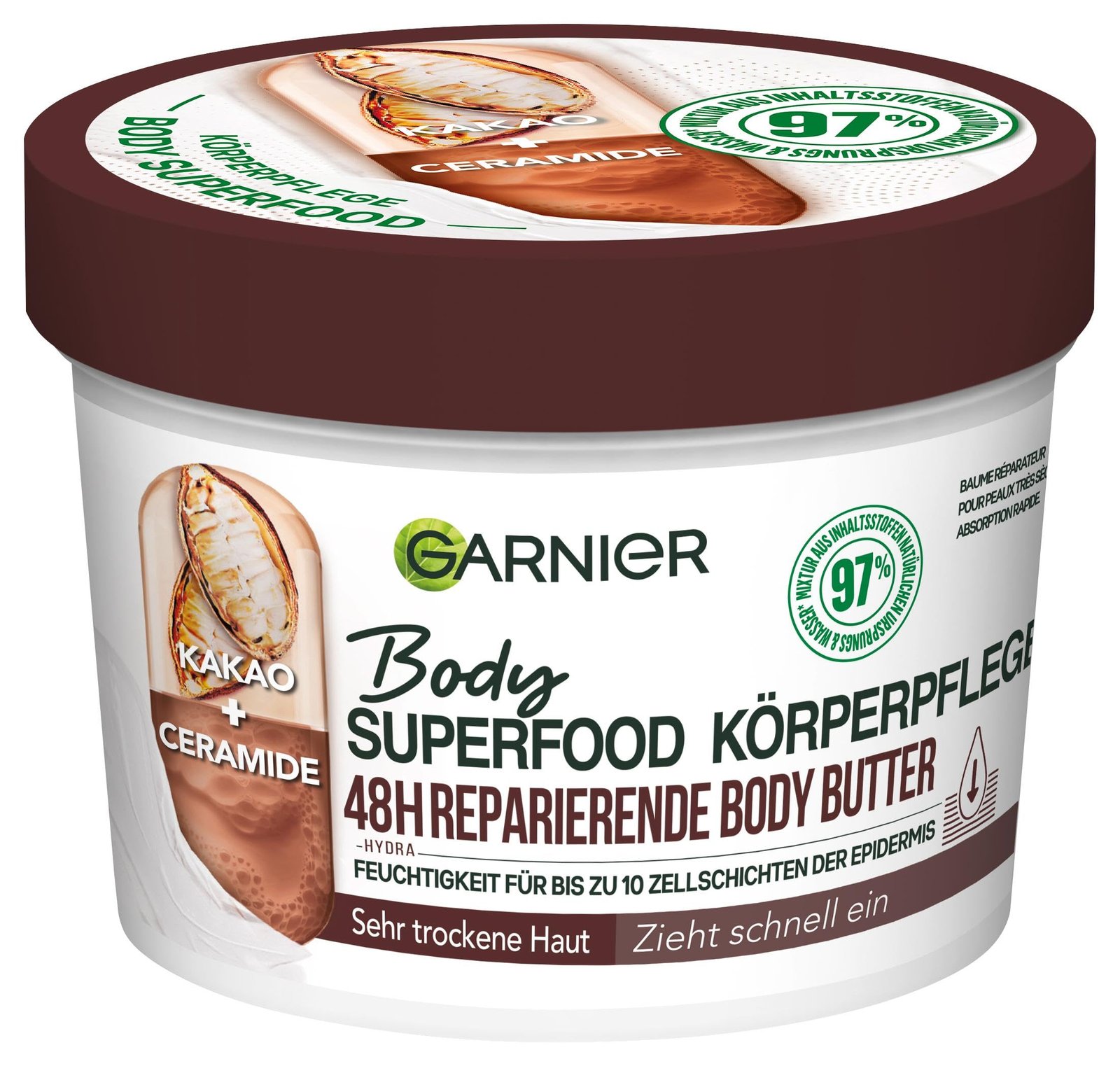 Garnier Reparierende Körperpflege für trockene Haut, Body Butter mit Kakaobutter und Ceramiden, Für bis zu 48 Stunden Feuchtigkeit, Body Superfood, 1 x 380 ml