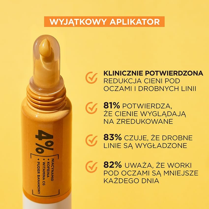 Unsere erste Augencreme mit hochkonzentriertem 4% FORMELD + KOFEINA + WITAMIN Cg + BANANO], um Müdigkeit, Augenringe und feine Linien für ein frisches, ausgereiftes Hautbild. Klinisch bestätigte Wirksamkeit: Reduzierung von 8 Zeichen von Hautermüdung. Geeignet für müde, matte Haut unter den Augen. Auf jedem Hautton getestet.|4% FORM [NIEDRIG + KOFEINA + WITAMINA Cg + BANAN-PUDER Die Marke Garnier wurde von Cruelty Free International im Rahmen des Leaping Bunny Programms offiziell genehmigt. Das Produkt enthält keine tierischen Ursprungs.