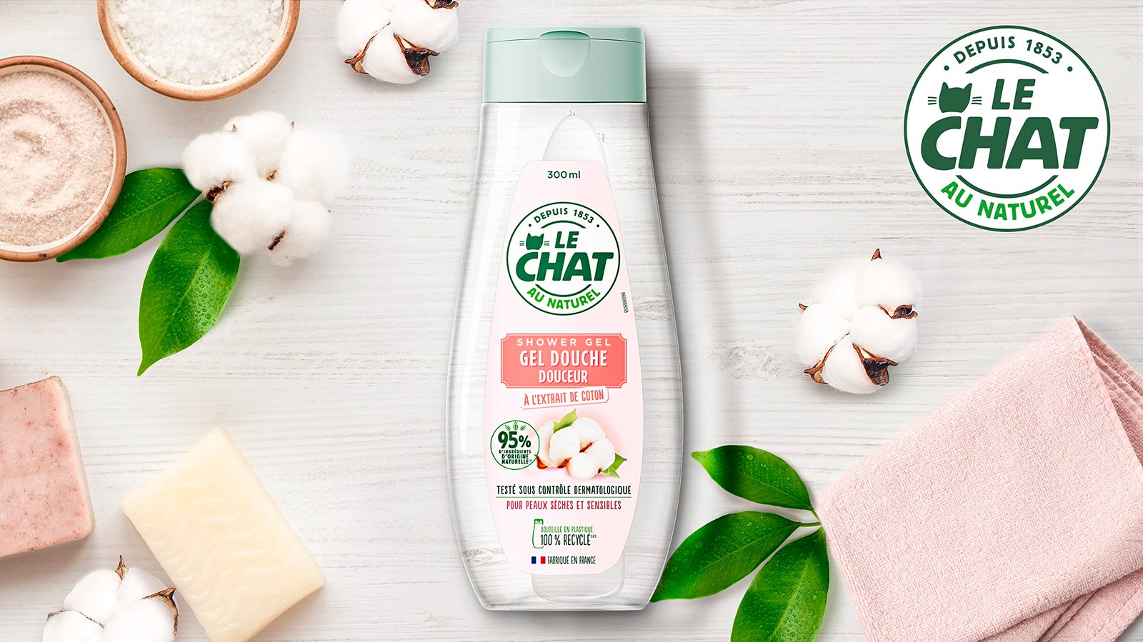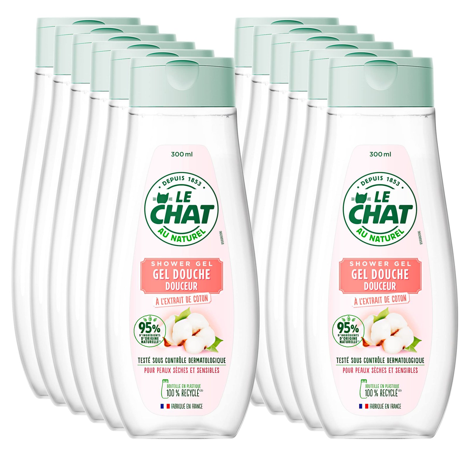 Le Chat Duschgel für den Körper, weich, mit Baumwollextrakt, 95% Inhaltsstoffe natürlicher Ursprungs, für trockene und empfindliche Haut, getestet unter dermatologischer Kontrolle, 300 ml, 12 Stück