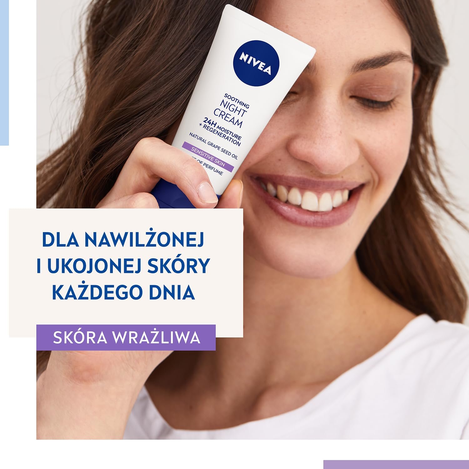 Beruhigende Nachtpflege – Die Formel überzeugt mit dem NIVEA 3-fach Komplex für 24h Feuchtigkeit und gleicht den natürlichen Feuchtigkeitsgehalt der Haut aus.|Für sensible Haut – Die parfumfreie NIVEA Hautpflege Creme reduziert 3 Zeichen von sensibler Haut über Nacht: 1. Rötungen 2. Spannungsgefühl, 3. Trockenheit.|Regeneriert die Haut – Die Hautcreme unterstützt die natürliche Widerstandskraft der Haut gegen Irritationen: für frische und erholt aussehende Haut am Morgen.|Haut und Umwelt – Aus Liebe zu Haut und Umwelt ist die Formel der Feuchtigkeitscreme vegan*, enthält 0% Mikroplastik und die Tube ist zu 89% recyclebar. *Keine Inhaltsstoffe tierischen Ursprungs|Lieferumfang und Details – NIVEA Beruhigende Nachtpflege 24h Feuchtigkeit + Regeneration, Gesichtspflege mit Traubenkernöl, Süßholzextrakt, Provitamin B5, Artikelnummer 82348