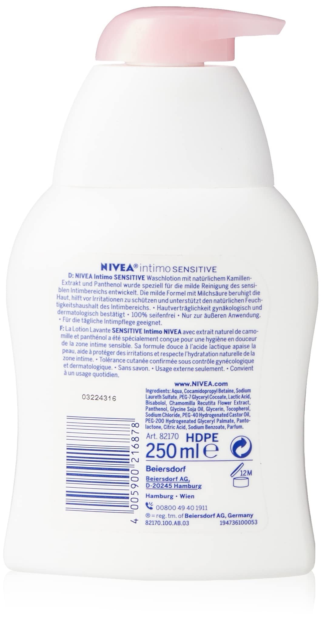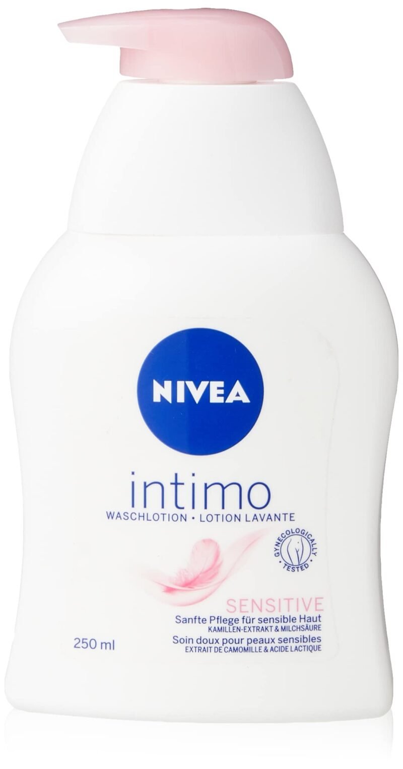 Reinigung & Pflege – Die lindernde NIVEA Intimo Waschlotion Sensitive reinigt sanft und hilft mit einer milden Formel vor Irritationen zu schützen.|Sensible Haut – Speziell für die milde Reinigung des sensiblen Intimbereichs entwickelt, beruhigt die Waschlotion die Haut ganz ohne Seife.|Tägliche Anwendung – Die Waschlotion für den Intimbereich unterstützt den natürlichen Feuchtigkeitshaushalt des Intimbereichs – ideal für die tägliche Anwendung.|Milde Formel – Die hautberuhigende Formel mit Milchsäure, Panthenol und Kamillenextrakt hilft vor Irritationen zu schützen. Hautverträglichkeit gynäkologisch und dermatologisch bestätigt.|Lieferumfang & Details – NIVEA Intimo Waschlotion Sensitive (250 ml), mildes Waschgel für Intimbereich ohne Seife, sanfte Intimreinigung und Pflege, Artikelnummer 82170