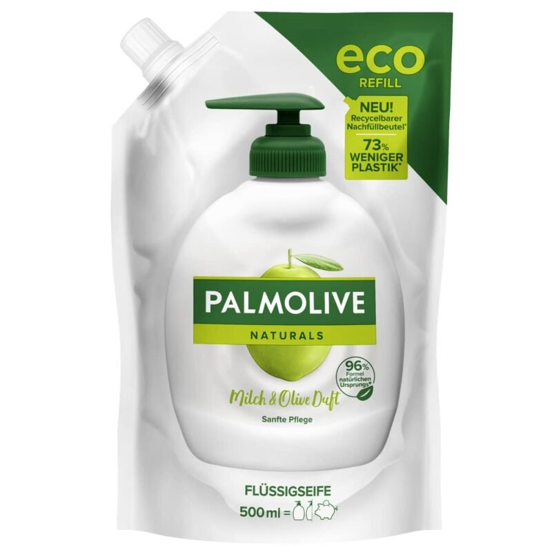 Palmolive flüssige Handseife Milch & Olive mit Milchproteinen und Oliven-Duft|Deine Hände werden von einem wunderbaren Duft umhüllt und fühlen sich seidig zart gepflegt an|96% der Formel natürlichen Ursprungs (Wasser und natürlich gewonnene Inhaltsstoffe mit minimaler Verarbeitung|95% biologisch abbaubare Formel (bezogen auf die organischen Inhaltsstoffe)|Im praktischen Nachfüllbeutel|Für alle Hauttypen geeigent, dermatologisch getestet|Lieferumfang: 1 x 500ml flüssige Handseife Palmolive Naturals Milch & Olive im Nachfüllbeutel