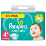 Pampers Baby Windeln Große 4+ (10-15kg) Baby-Dry, Maxi Plus, 62 Stück, BIG PACK, bis zu 12 Stunden Rundum-Auslaufschutz