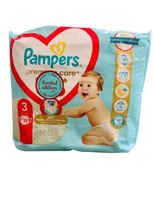 Pampers Premium Care Windeln, Größe 3, 28 Stück, 6kg – 11kg, Bester Schutz und Komfort von Pampers in leicht anzubringenden Windeln