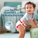 Unser BESTER Komfort mit 3X Schutz vor Auslaufen|360° weiches Bauchbündchen, das sich angenehm den Bewegungen deines Babys anpasst und hilft, Auslaufen vorzubeugen|Mit einem super saugkräftigen Kern, der Flüssigkeit sofort aufnimmt, und einem Stop & Schutz Täschchen, das ein Auslaufen am Rücken verhindert|Einfaches Windelwechseln: zum Anziehen hochziehen, zum Ausziehen die Seitenbündchen aufreißen, einrollen und dank Klebestreifen einfach entsorgen