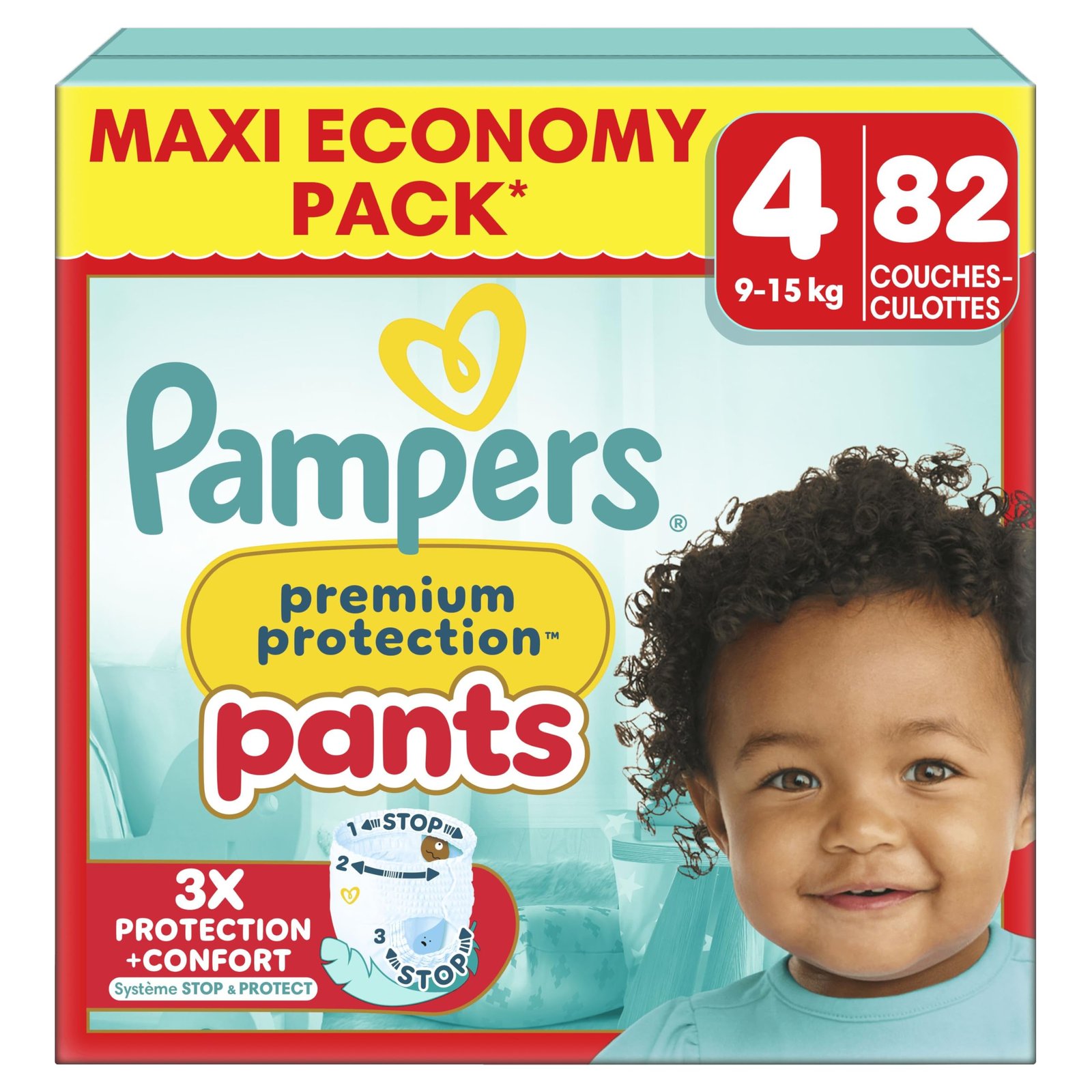 Pampers Premium Protection Pants Große 4, 82 Windeln, 9 kg – 15 kg, mit einem 360°-Halt und weichen Auslaufbarrieren, 2 mal breiter als vorne für Komfort und Schutz