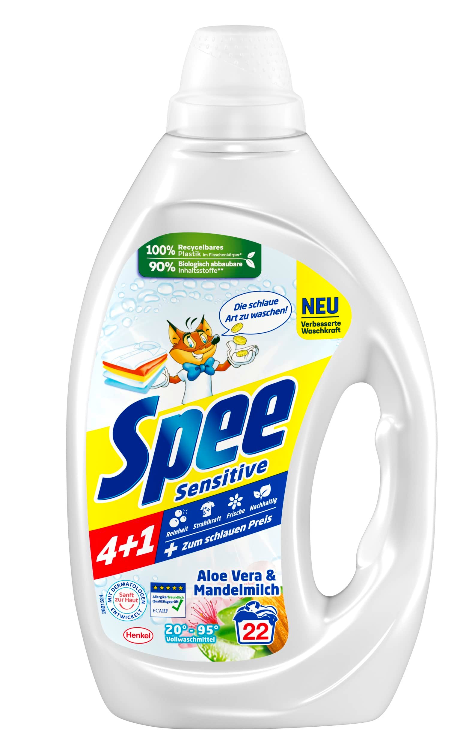 Spee Sensitive – Das Sensitive Waschmittel mit Aloe vera und Mandelmilch vereint Reinheit, Strahlkraft und Frische für die Wäsche und das jetzt noch nachhaltiger|Verbesserte Waschkraft – Dank konzentrierter Formel reinigt Spee Sensitive die Wäsche effektiv, ist dennoch sanft zur Haut und eignet sich als Waschmittel für Allergiker|Sensitive 4 + 1 – In dem Flüssigwaschmittel vereinen sich 4 Vorteile in nur einem Produkt: Reinheit, Strahlkraft, Frische und wäscht jetzt noch nachhaltiger|100 Prozent recycelbar – Spee Sensitiv Gelwaschmittel kommt in einer Verpackung aus 100 Prozent recycelbarem Plastik und hat eine Formel mit 90 Prozent biologisch abbaubaren Inhaltsstoffen|Schont die Umwelt – Durch die verbesserte, leistungsstarke Formel wird weiße Wäsche und helle Wäsche beim Wäschewaschen von 20 °C bis 95 °C speektakulär sauber