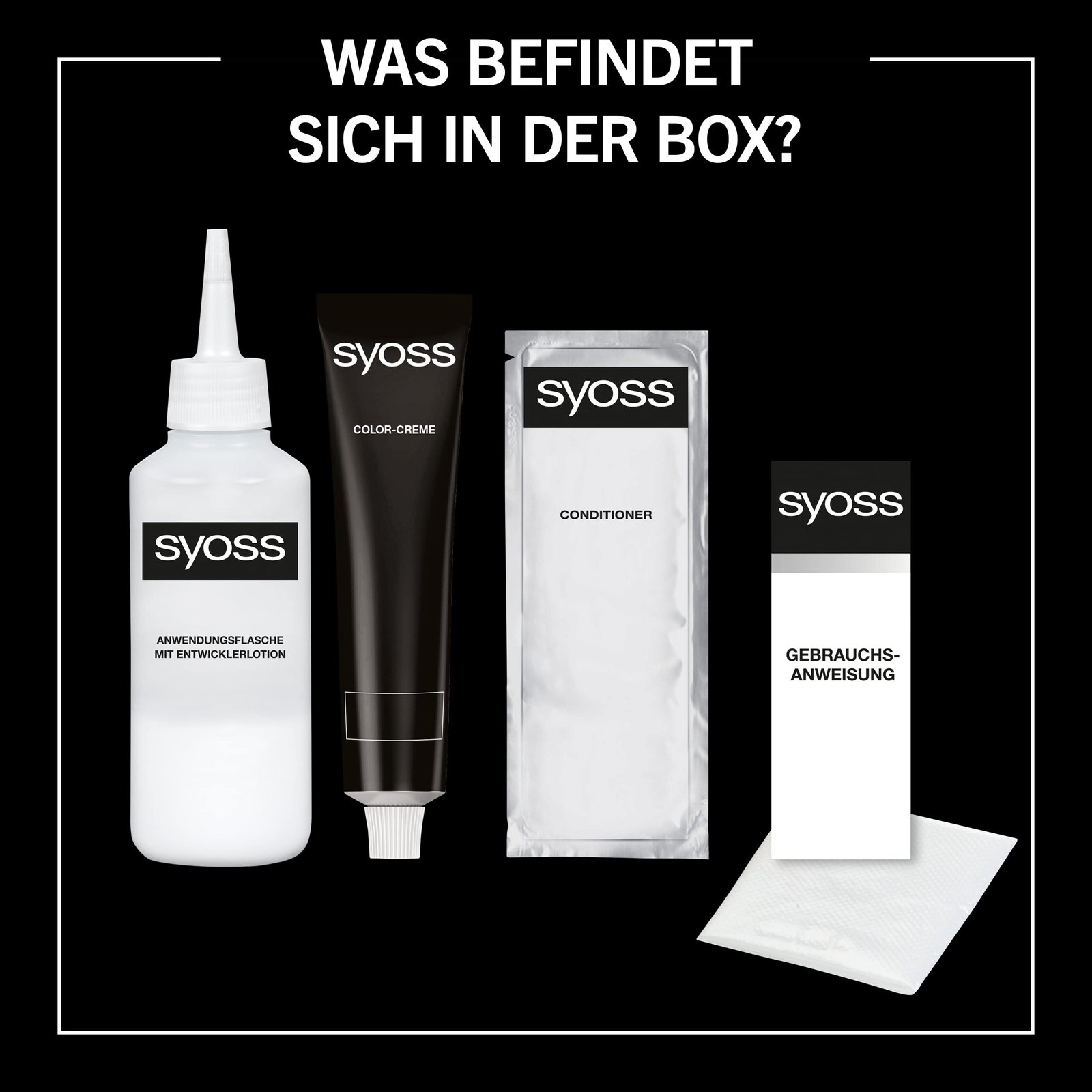 Intensive Farben – Syoss Color ist eine dauerhaft haltbare Coloration für intensive, langanhaltende Farben, professionelle Grauabdeckung & bis zu 70 % weniger Haarbruch*|Konzentrierte Farbpigmente – Die Farbpigmente der Syoss Haarfarbe dringen tief in alle Haarschichten ein – für eine intensive Farbe und professionelle Grauabdeckung|Anti-Schädigungs-Pflege – Die Anti-Schädigungs-Pflege verleiht eine verbesserte sichtbare Haarqualität & bis zu 70 % weniger Haarbruch*|Salonplex-Technologie – Dank Salonplex Anti-Schädigungs-Pflege-Technologie werden beim Haare Färben Haarschäden ausgeglichen und die Haarfaserbindungen erneuert|Syoss Sortiment – Entdecke das komplette Syoss Sortiment und wähle die passende Nuance aus den unterschiedlichen Haarfarben aus