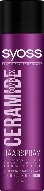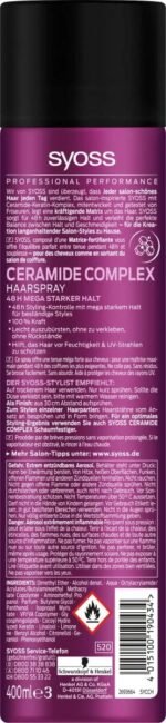 Syoss Ceramide Hairspray bietet 48h Style-Control für widerstandsfähige Styles mit mega starkem Halt|Mit Ceramid-Keratin-Komplex|100% Stärke|Leicht auszubürsten, klebt nicht, keine Rückstände|Hilft, das Haar vor Feuchtigkeit und UV-Strahlung zu schützen