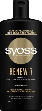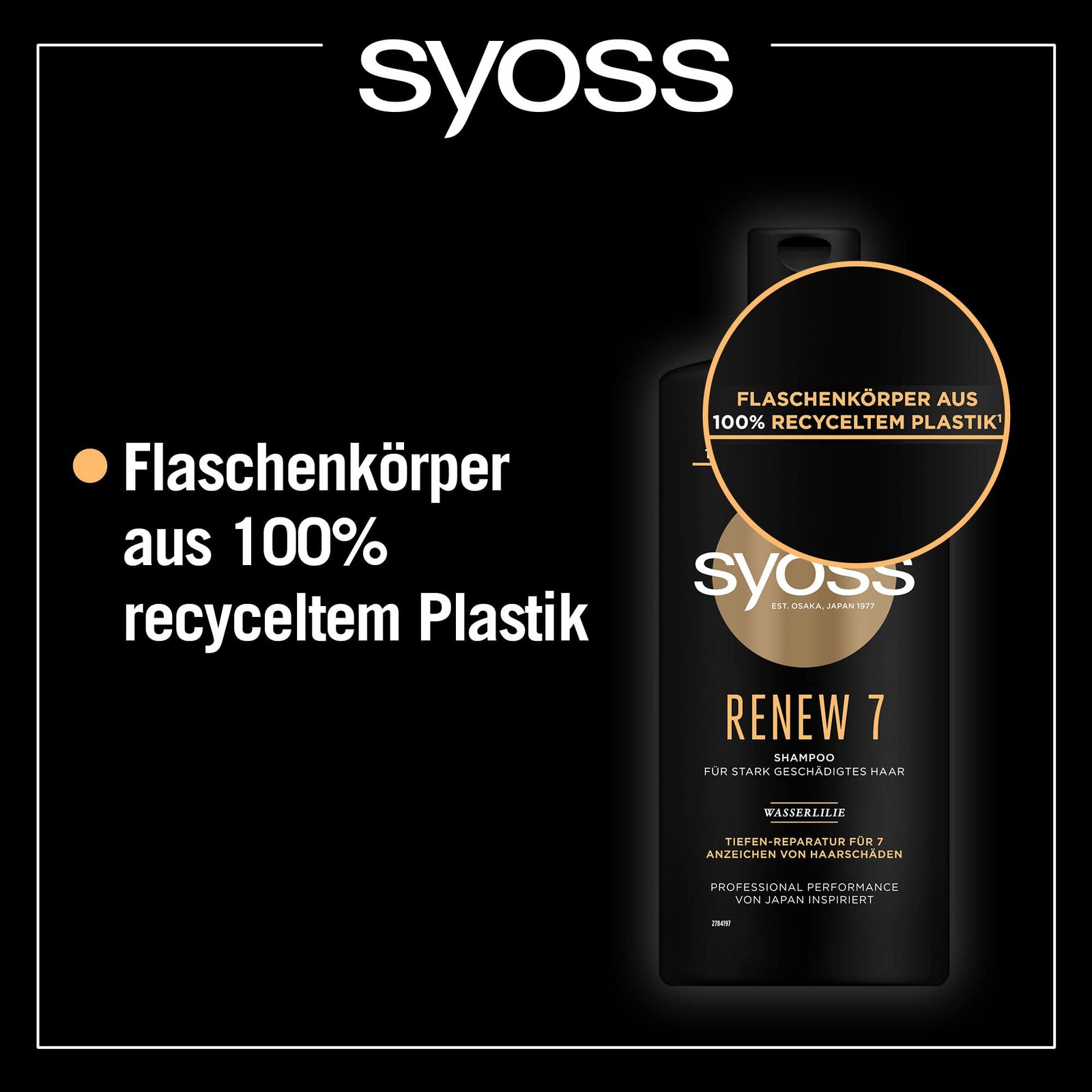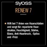 Renew 7 Shampoo – Das Syoss Renew 7 Shampoo eignet sich für vielfach geschädigtes Haar und hilft bei 7 Arten von Haarschäden|Tiefen-Reparatur – Dank Tiefen-Reparatur-Formel verleiht das Haarpflege-Shampoo eine reparierte Haarstruktur, Feuchtigkeit, Stärke und Glanz|Syoss Renew 7 Formel – Dank der Formel mit Amino-Komplex bekämpft die Haarpflege für kaputtes Haar 7 Arten von Haarschäden und hilft, gesund aussehendes & schönes Haar zu schaffen|Bekämpft Haarschäden – Das Renew 7 Shampoo hat außerdem eine Anti-Frizz-Wirkung und hilft bei Spliss sowie Haarbruch|100 % recyceltes Plastik – Der Flaschenkörper des Syoss Shampoos besteht aus 100 % recyceltem Plastik (Kappe ausgenommen)
