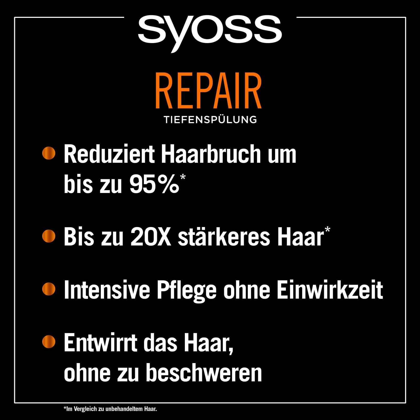 Reichhaltige Pflege – Die Syoss Spülung ist reichhaltiger als eine Spülung und leichter als eine Kur – für gesund aussehendes und widerstandsfähiges Haar|Von Experten entwickelt – Die Spülung mit konzentrierten Aminosäuren und Wakame-Alge sorgt für bis zu 95 % weniger Haarbruch* und bis zu 20 Mal stärkeres Haar**|Hair Repair Haarpflege – Dank reichhaltiger Formel repariert die Spülung bereits bestehende Schäden, beugt zukünftigen Schäden vor und entwirrt es, ohne zu beschweren|Inhaltsstoffe natürlichen Ursprungs – Die Tiefenspülung enthält 97 % Inhaltsstoffe natürlichen Ursprungs (davon 85 % Wasser) und die Tube besteht aus 50 % recyceltem Plastik (Kappe ausgenommen)|Einfache Anwendung – Den Conditioner nach dem Shampoonieren sanft in nasses Haar einarbeiten und gründlich ausspülen – ganz ohne Einwirkzeit