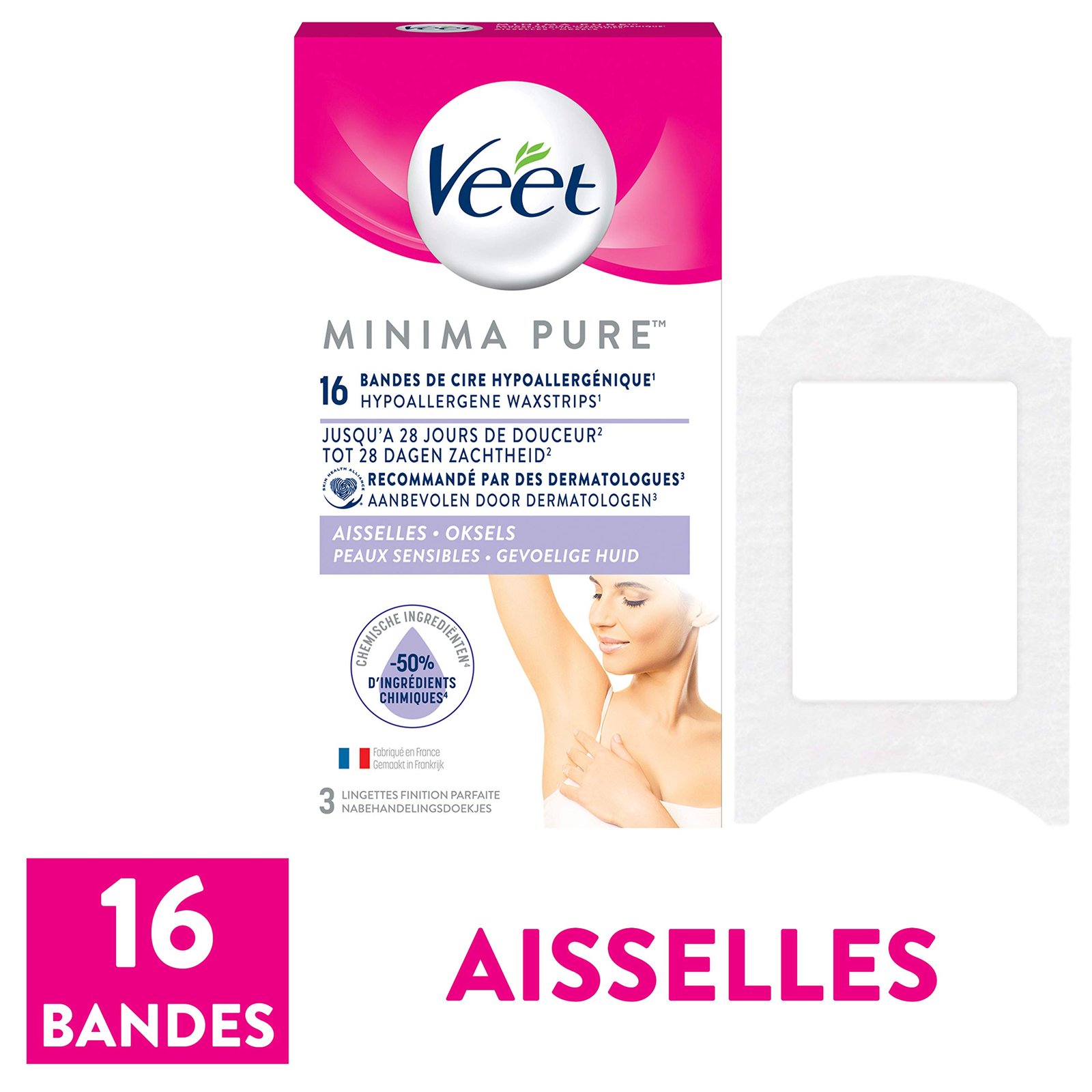 Minima Pure Kaltwachs – Die Minima Pure Wachsbänder sind hypoallergen, transparent und parfümfrei. Sie sind mit -50 % chemischen Inhaltsstoffen und nur 5 Inhaltsstoffen formuliert. Enthält 3 Sets mit 16 Wachsstreifen und 3 Tüchern für ein perfektes Finish.|Effektiv auf kurzen Haaren – Die Minima Pure Kaltwachsstreifen wurden entwickelt, um kurze Haare ab 1,5 mm zu entfernen, also müssen Sie nicht so lange warten, bis Sie wieder enthaaren. Mit den Wachsstreifen von Minima Pure erhalten Sie eine weiche Haut, ohne von unansehnlichem Nachwachsen gestört zu werden|EINFACHE ANWENDUNG – Die Veet Wachsstreifen sind gebrauchsfertig und ermöglichen es Ihnen, Ihre Haare schnell loszuwerden, ohne das Wachs in der Mikrowelle erwärmen zu müssen. Reiben Sie einfach den Wachsstreifen zwischen Ihren Händen, um das Wachs zu erwärmen und es ist einsatzbereit!|LANGE ERGEBNISSE – Durch die regelmäßige Enthaarung mit Wachs wachsen Ihre Haare weniger, feiner und weicher. Genießen Sie also eine lang anhaltende Weichheit und seien Sie sicher, dass Ihre Haare nicht dicker nachwachsen|Veet QUALITÄT – Dank seiner Easy-Gelwax-Technologie entfernt das Wachs selbst die kürzesten Haare (1,5 mm) und bietet Ihnen eine Weichheit von bis zu 28 Tagen. Die feuchtigkeitsspendende Formel sorgt dafür, dass Ihre Haut mit Feuchtigkeit versorgt und weich ist. Die Veet Serie passt sich jedem Hauttyp an.