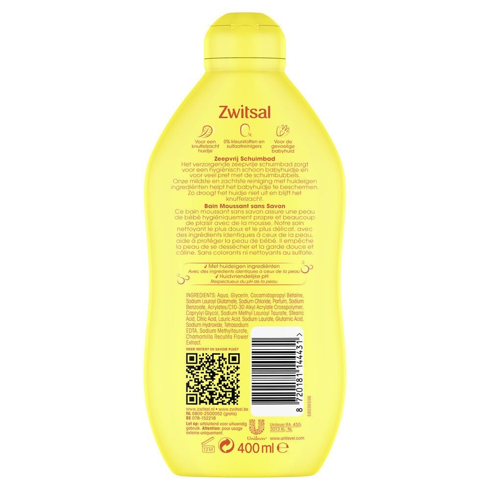 Zwitsal Seifenfreies Schaumbad 400 mlSchweiz seifenfreier Schaumbad, die mildste Pflege, sanft für empfindliche Babyhaut. Schweizer Baby seifenfreier Schaumbad für kuschelweiche HautDas verbesserte Schweizer Schaumbad ist unser mildeste und weichste Schaumbad überhauptEin pflegendes Schaumbad mit hauteigenen Inhaltsstoffen und hautfreundlichen pHDas weiche, seifenfreie Schaumbad enthält 0% Farbstoffe und SulfatreinigerDermatologisch getestet und für das empfindliche babyhautseifenfreie Schaumbad, mit dem